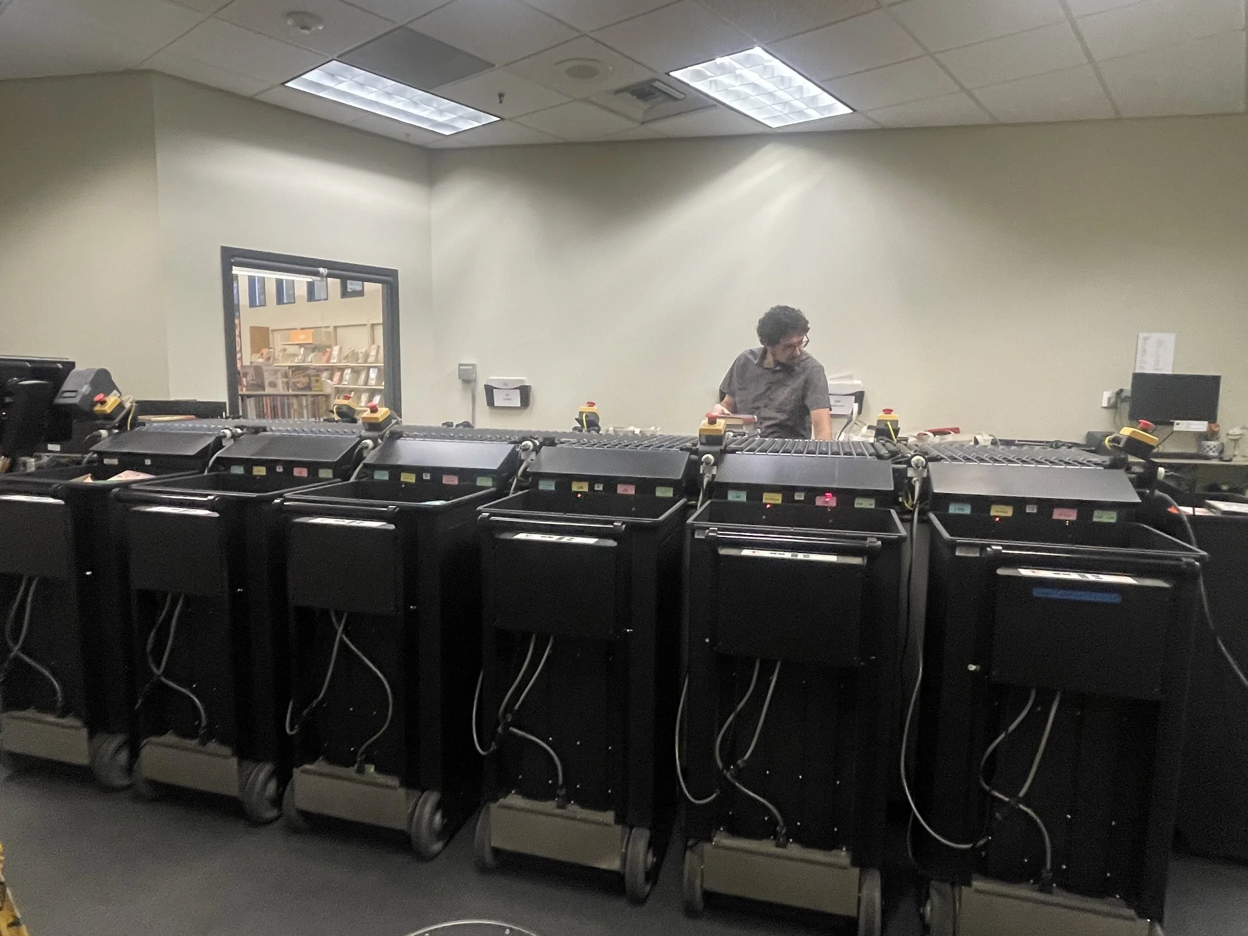 Our tour began on the first floor, where we watched the Automated Materials Handling machine sorting books destined for branches across the county. As the central hub of the county library system, materials requested from other branches pass through the SLO library, and this machine now manages sorting that staff once handled by hand. Watching it work through a large viewing window is oddly mesmerizing, but more importantly, it clearly saves staff time, allowing them to focus on working directly with patrons.