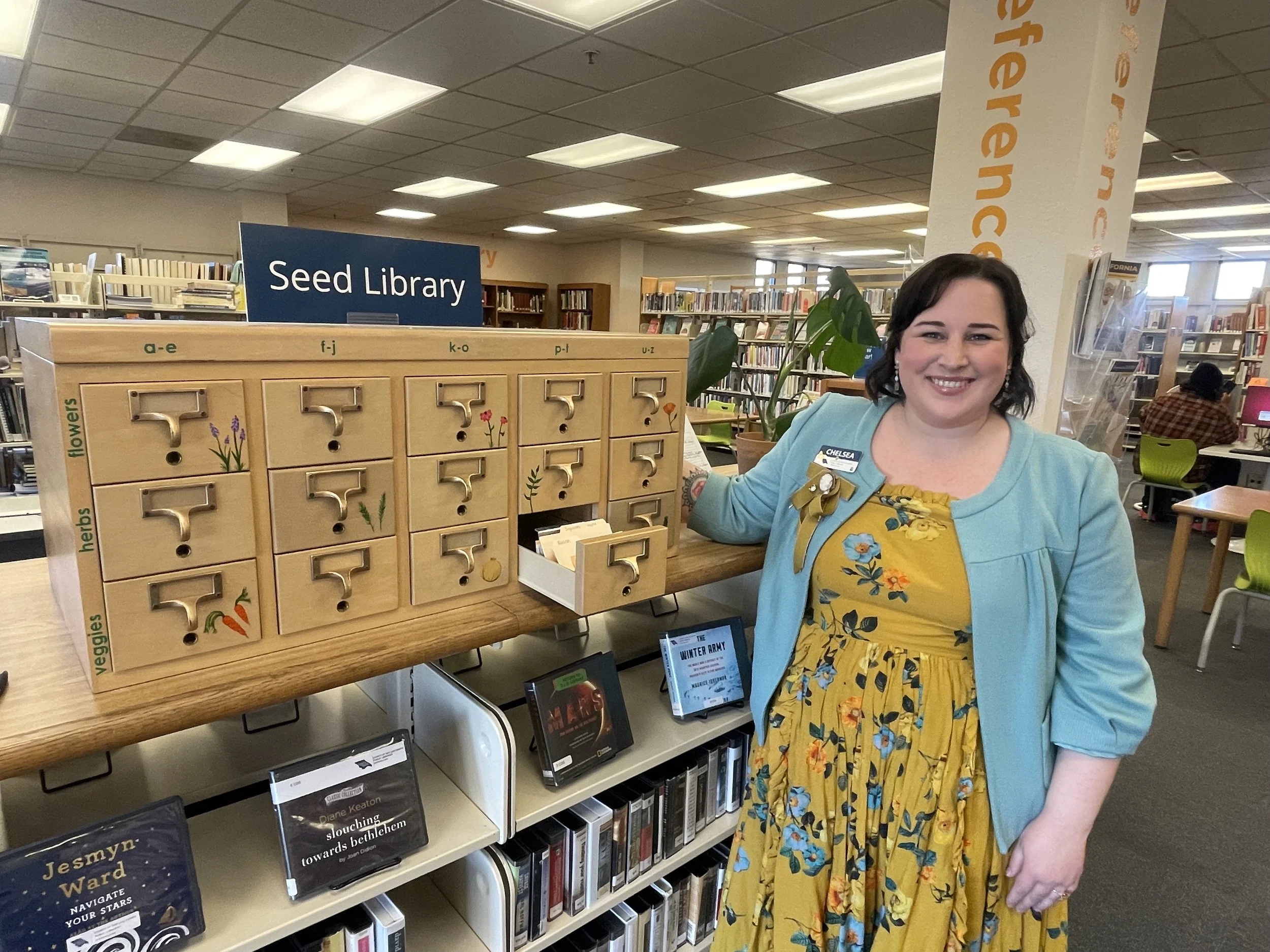The third floor offers a noticeable shift in atmosphere. This quiet zone is home to the nonfiction and reference collections, along with computers and worktables for studying and focused work. Tucked into this space is one of the library’s most charming features, the seed library. Chelsea proudly described it as her “baby.” Seeds are packaged into small envelopes and filed into a mini card catalog, and patrons can take up to ten packets per season, choosing from vegetables, herbs, or flowers. Last year alone, more than two thousand seed packets were shared. The seed library is just one example of how deeply the library is connected to the community. Through partnerships with local seed groups and organizations like Sustainable SLO, along with an internal green team focused on sustainability, the library continues to find thoughtful ways to support both environmental stewardship and community connection.